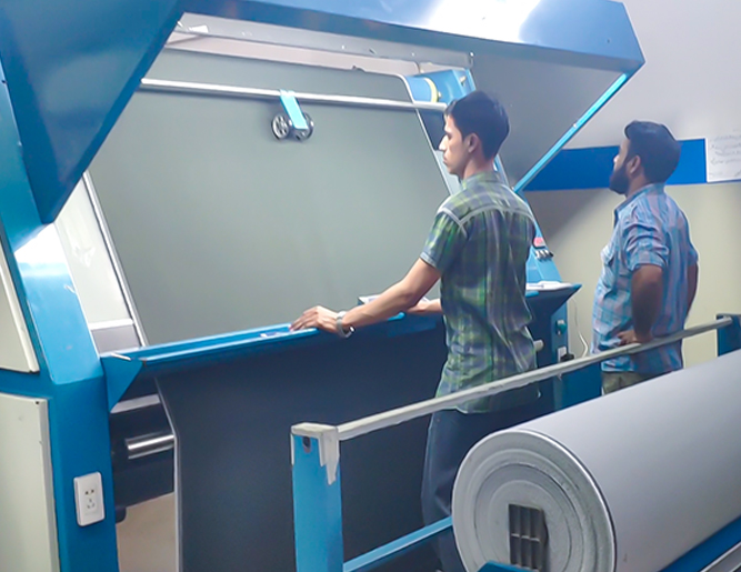 Post-dyeing, fabrics are inspected under 4-point system standards to ensure quality before moving to cutting.