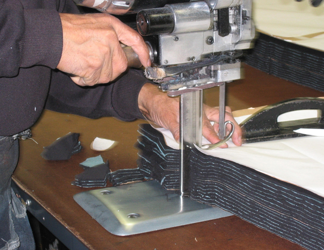 Fabric is laid on cutting tables and sliced according to the approved patterns using manual or automatic cutting machines.