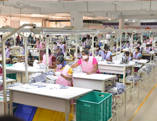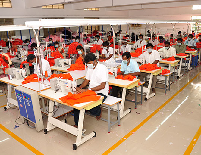 Garments are stitched using industry-grade machines by skilled operators following a production line model.